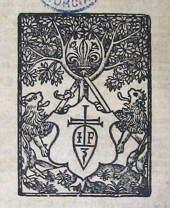 Flor de lis sobre un árbol y pendiente de él un escudo sostenido por dos leones con las iniciales I F J