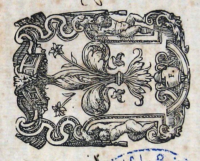 Flor de lis, en la parte inferior un jarrón con la inicial F. En cartela