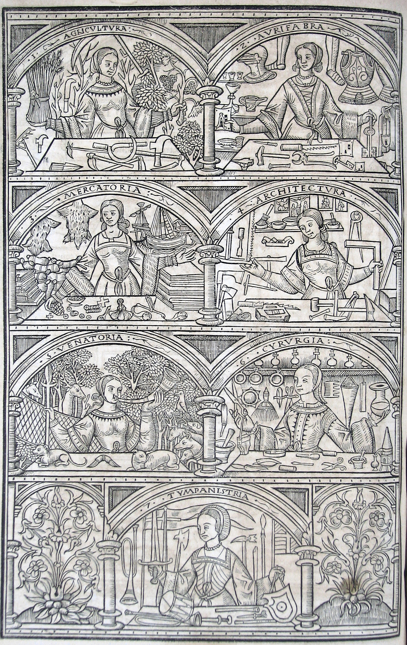 Oficios Civiles (Plebeyos), representados por siete mujeres en celdas individuales. Agricultura, Orfebrería, Mercaduría, Arquitectura, Venatoria (caza), Cirugía, Timpanistería