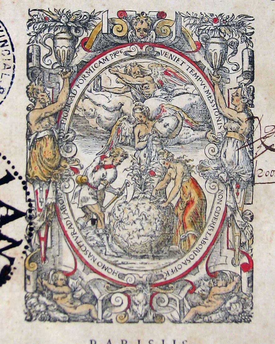 Figuras alegóricas cultivando la tierra, bajo la mirada de Chronos. En cartela con óvalo. Coloreado