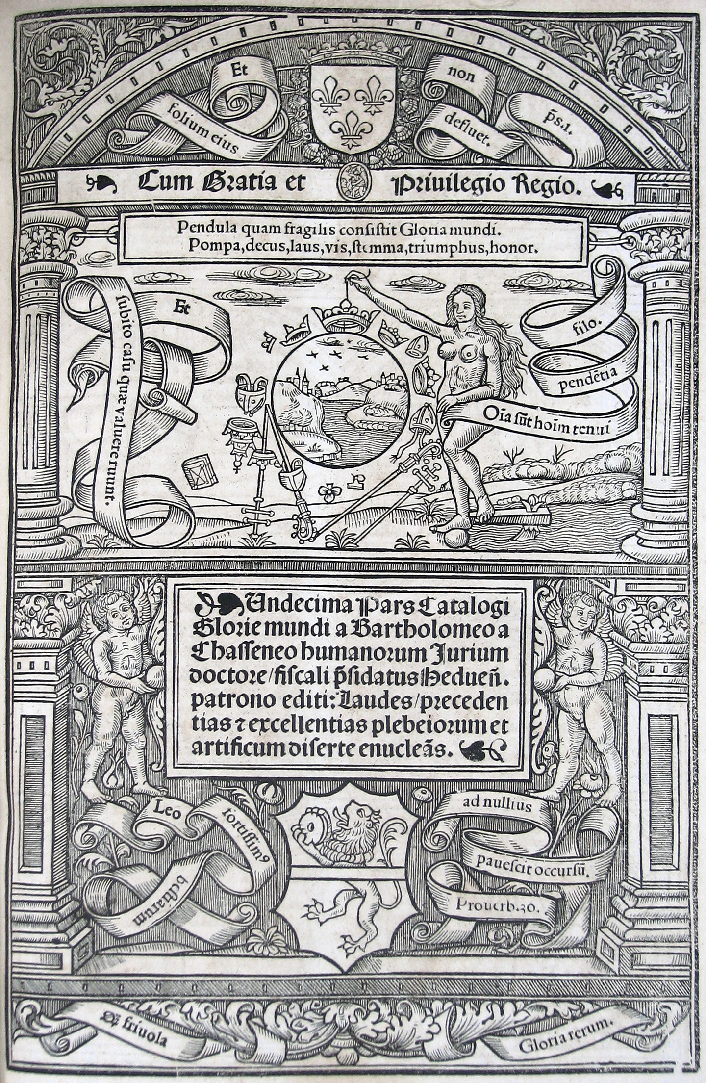 Retablo arquitectónico con dos escenas. La superior, mujer desnuda sostiene círculo con paisaje, rodeado de coronas y mitras. La inferior, dos angelotes sujetan un rectángulo con el título