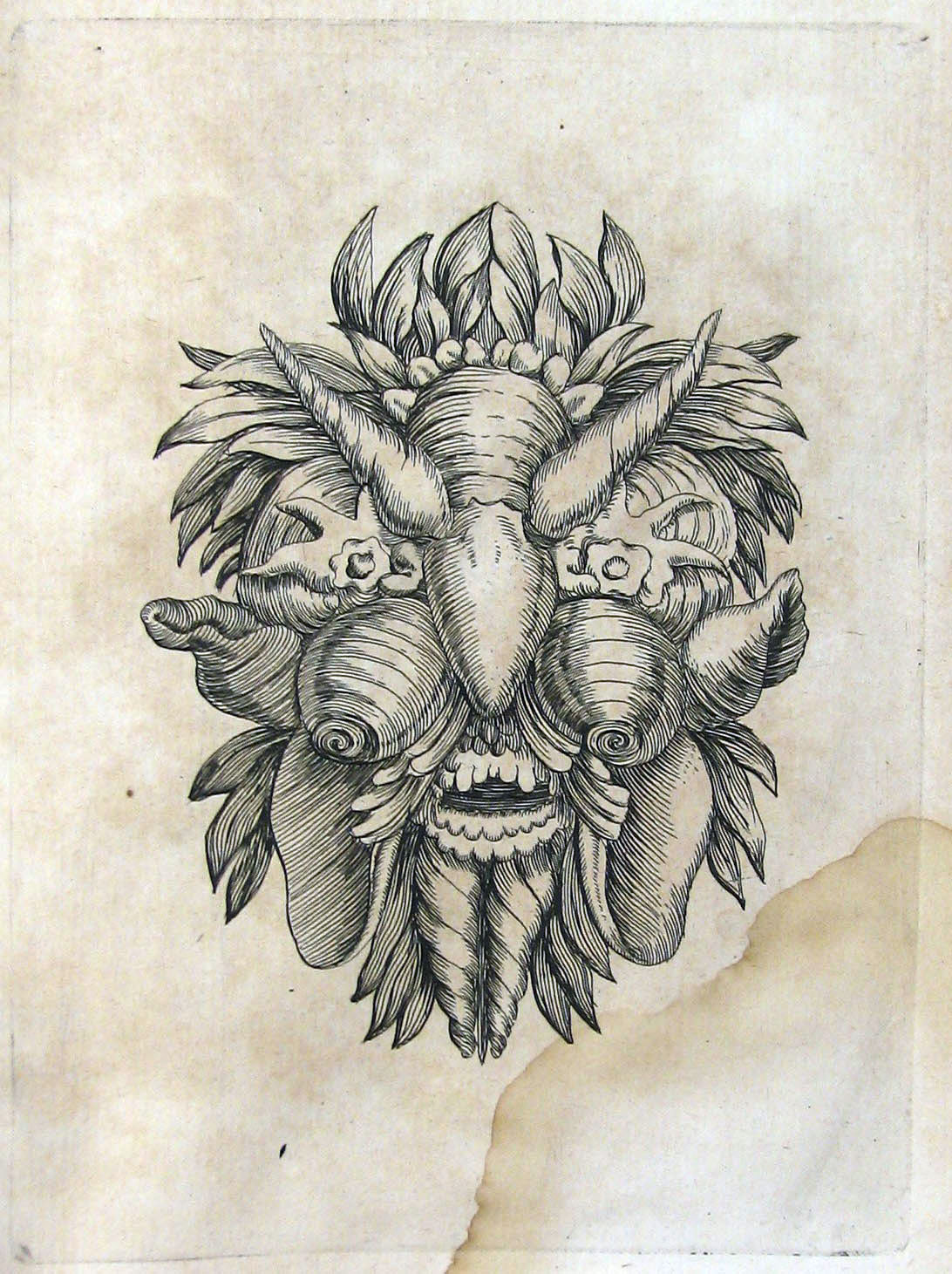 Cabeza humana hecha con conchas y moluscos