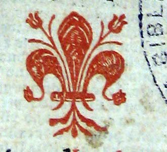 Flor de lis ornamentada con dos flores de lis naturales que salen de los lados. Color rojo