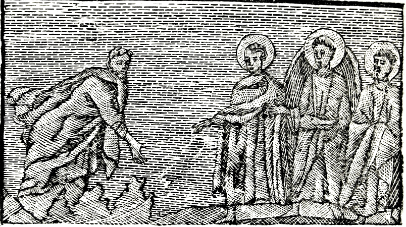 Hombre en barca se acerca a la orilla donde hay tres figuras