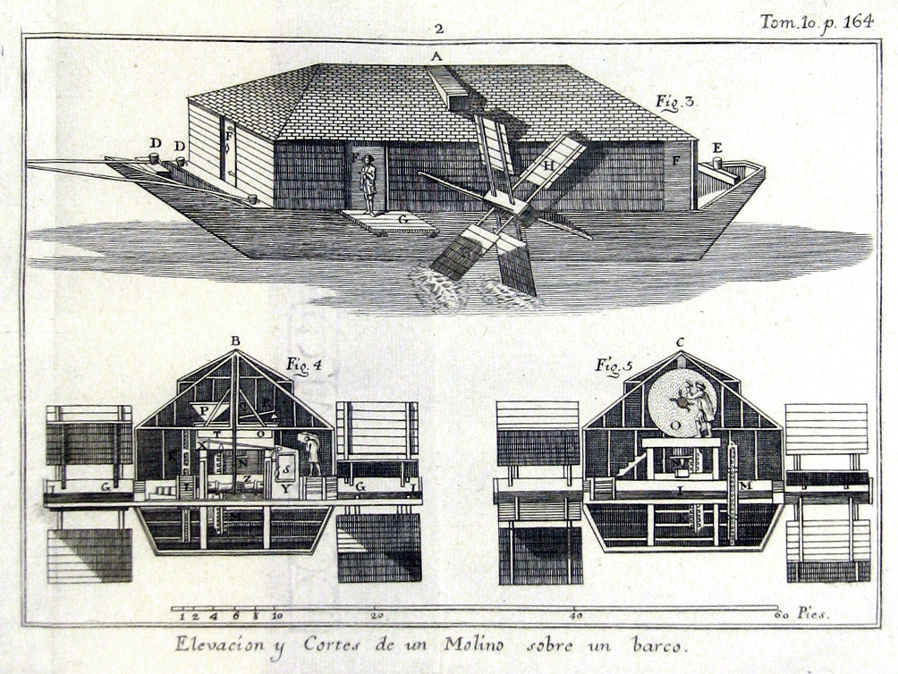 "Elevación y cortes de un molino sobre un barco"