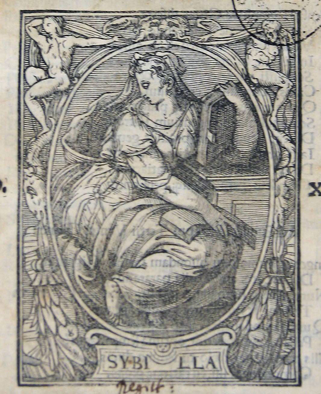 Sibila sentada que en el brazo izquierdo tiene un libro y sobre la rodilla otro. Abajo escrito: Sybilla. En cartela