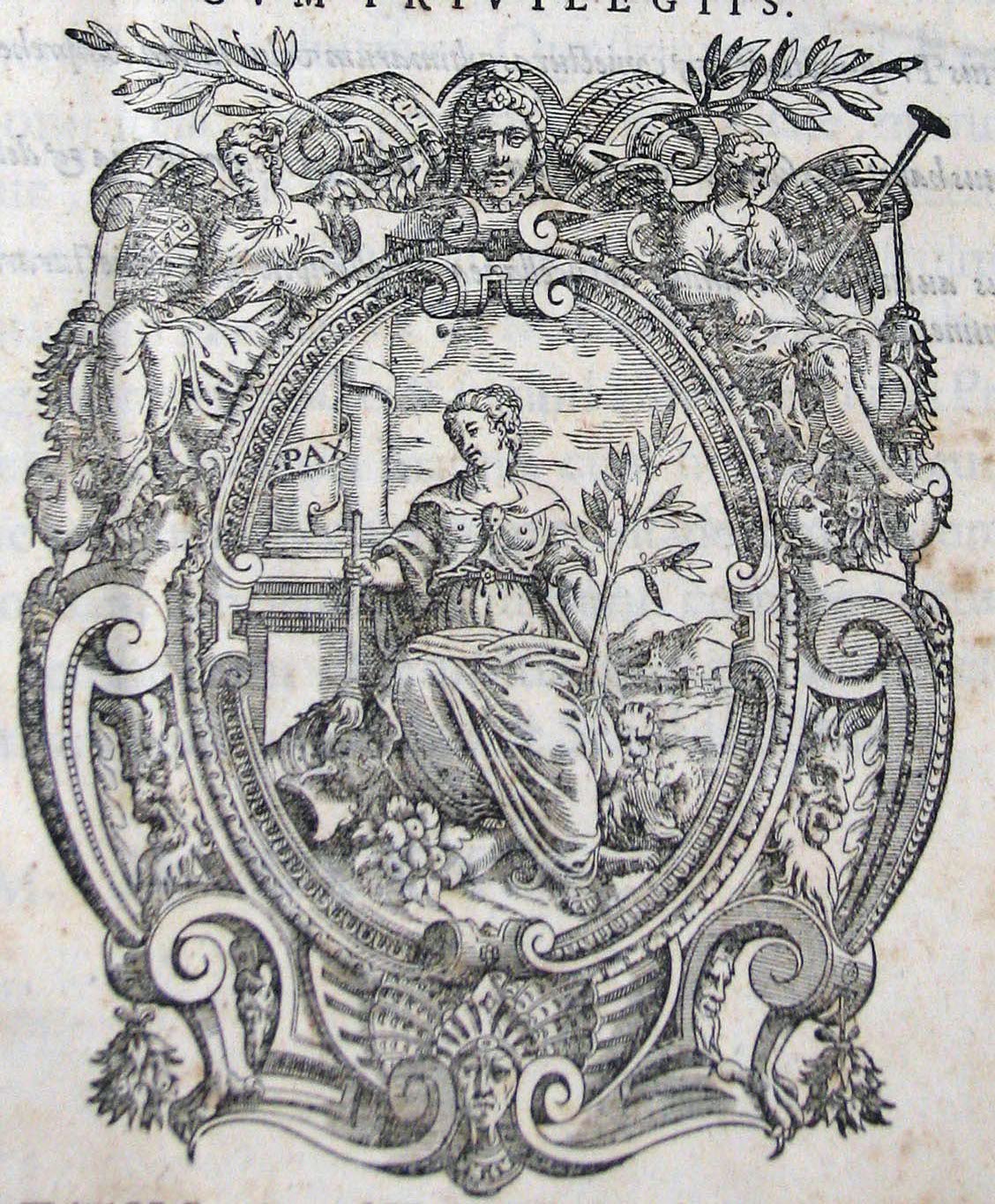 La Paz, dama sentada a los pies de una columna con un ramo de olivo en la derecha y una antorcha en la izquierda boca abajo. Sobre la columna: PAX