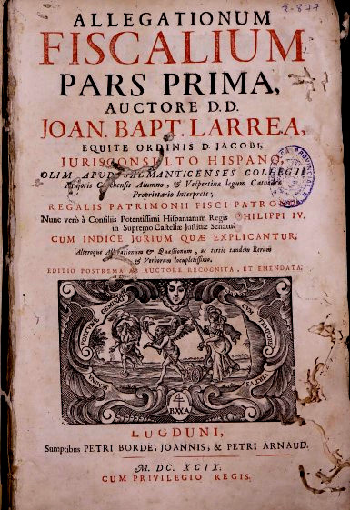 auctore D. D. Joan. Bapt. Larrea ... jurisconsulto hispano ... cum indice jurium quae explicantur, Alteroque Allegatiorum et Quaestionum, ac tertio tandem Rerum et Verborum locupletissimo.-- Editio postrema ab auctore recognita et emendata.