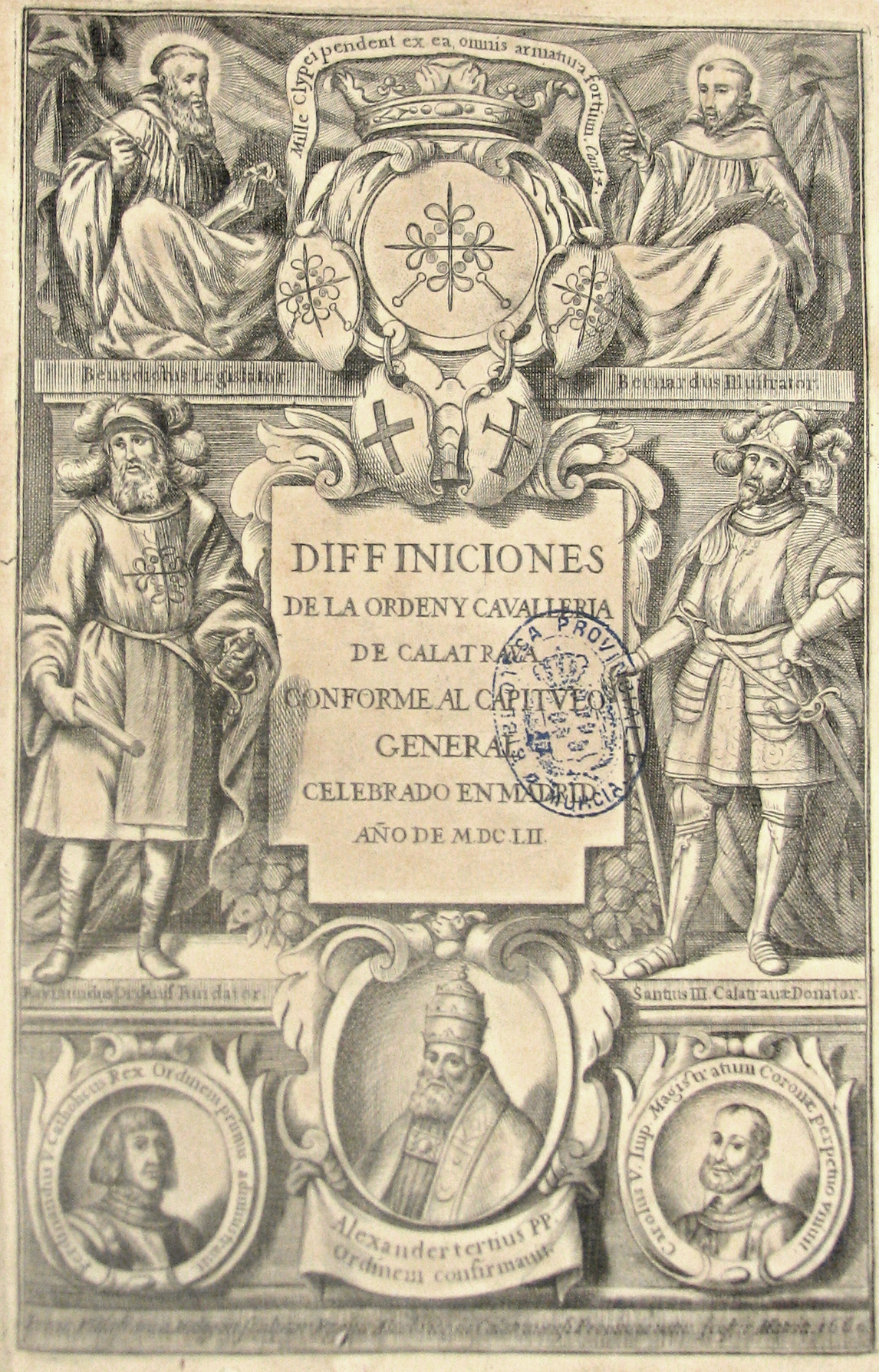 Personajes de la Orden de Calatrava. Raimundo de Fitero, Sancho III, San Benito, San Bernardo, el papa Alejandro III, Fernando el Católico y Carlos I. En la parte superior, San Benedicto y San Bernardo