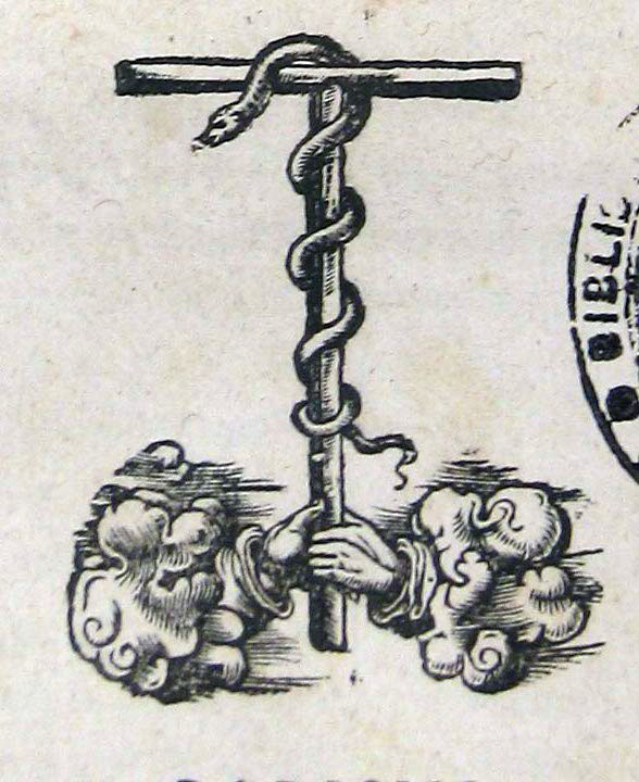 Dos manos que surgen de unas nubes sostienen un bastón en forma de tau, donde se enrosca una serpiente
