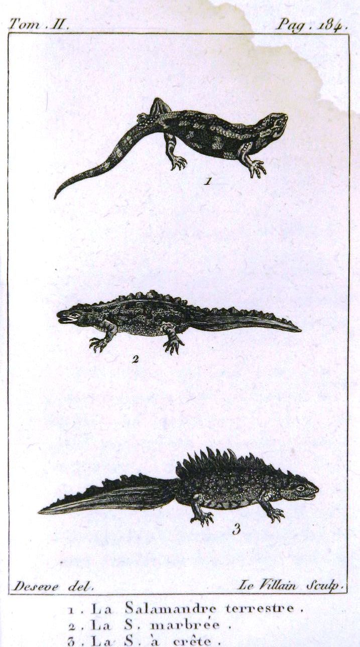 "La salamandre terrestre. La s[alamandre] marbrée. La s[alamandre] à crête"