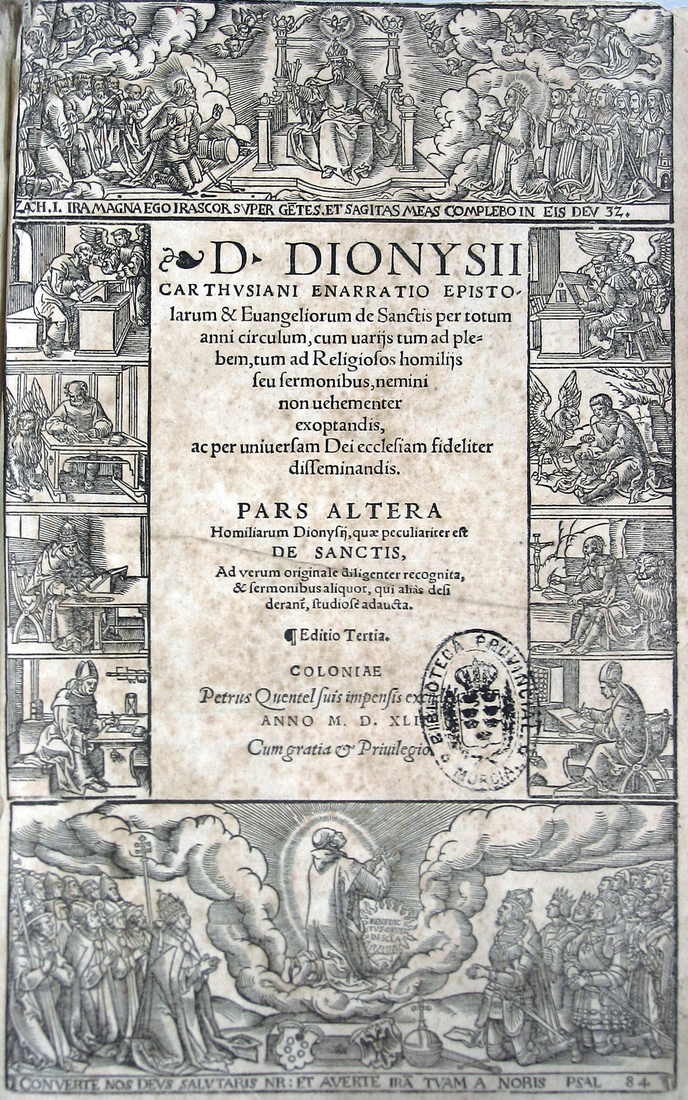 Dios rodeado de la Virgen María, Jesucristo y Santos. Ocho personas escribiendo. Religioso implorando al cielo, acompañado de autoridades civiles y eclesiásticas
