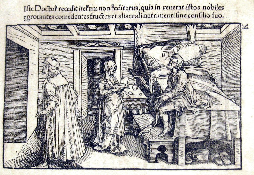 Doctor atendiendo a un enfermo al que cuida una mujer